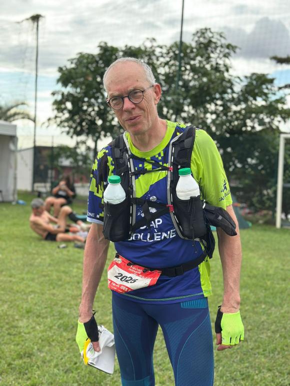J’étais parti pour faire la course avec Françoise, mais j’ai dû lâchement l’abandonner dans la montée de Focfoc pour éviter la barrière horaire en haut du volcan. Les barrières horaires avaient l’air larges, mais la météo a quelque peu compliqué les choses et fait baisser les moyennes horaires. Et je ne me plains pas trop, nous n’avons eu que la boue alors que les coureurs du 220 ont dû monter le volcan dans des ruisseaux ou des torrents…( remarques, à la limite ça glisse moins…).