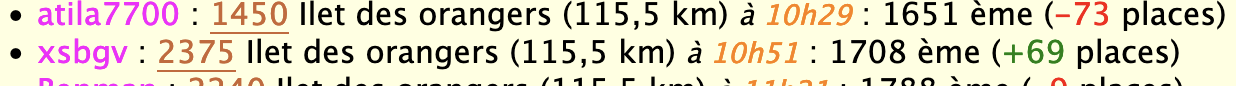 - Benman : 2240 Ilet des orangers (115,5 km) à 11h21 : 1788 ème (-9 places)