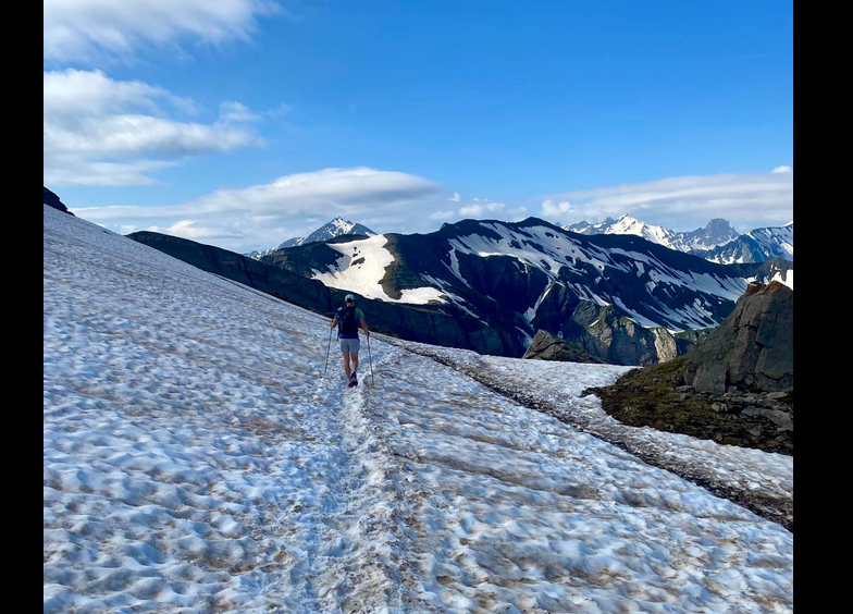 Il semble rester de la neige entre Bonhome et Cx du Bonhomme. Ainsi que sur la Crête des Gittes, en tout cas sur le versant Gittaz (où on passe entre le tunnel du Roc du Vent et le Col de la Sauce). Je me fie en cela à la photo suivante, pêchée sur le groupe FB du Tour du Mont-Blanc et qui, si je ne suis pas trop nul, semble prise justement entre le Bonhomme et la Croix du Bonhomme et où on voit la Crête des Gittes. En regardant bien, juste à droite de la Pierra Menta, on voit du blanc vers le Col à Tutu (qui est limite caché), aussi.