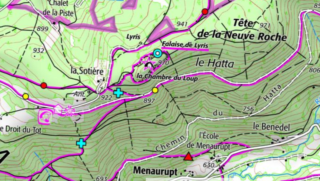 le-lent a écrit:Il commence cinq mètres au dessus du chemin de Fouchon, sur la carte au "d" de chambre du Loup et se termine à cinq mètres du bout de ladite boucle, en rose.