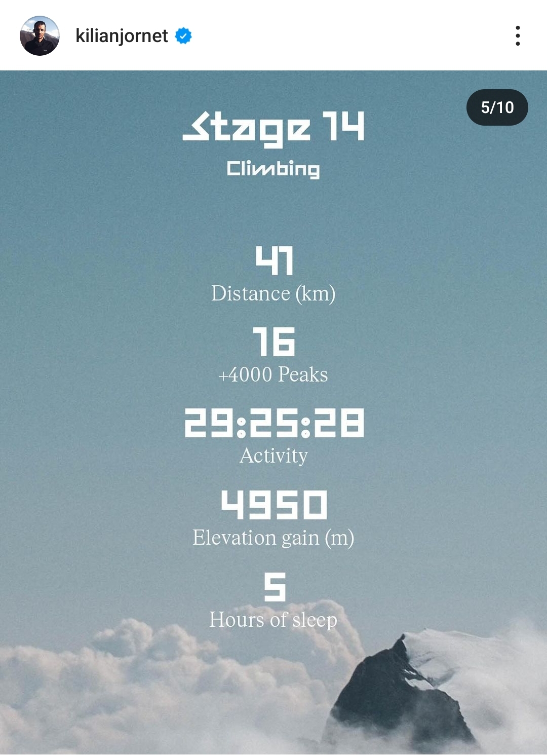 Et s'il termine au rythme actuel, à la louche : Mont-Blanc - Pont et Grand Paradis samedi, liaison -> Ecrins et 2 derniers sommets dimanche et peut être lundi => 20 ou 21 jours.