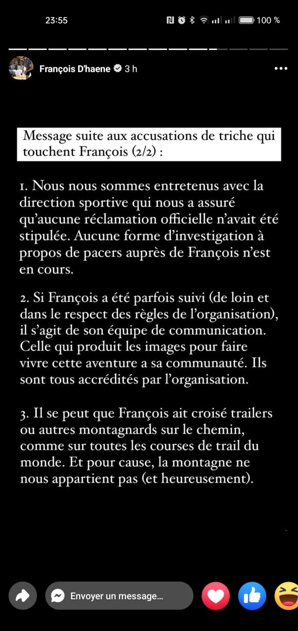 Ca vient bien de son compte officiel, je viens de voir la story postée il y a 50 minutes. Totalement dingue. On y apprend aussi que François vient de sortir en tête du ravito d'Ollomont.