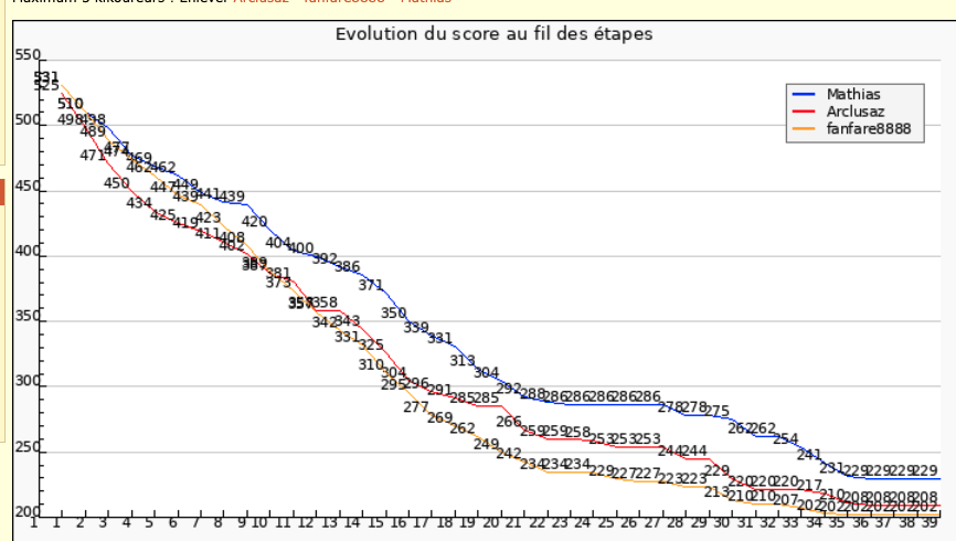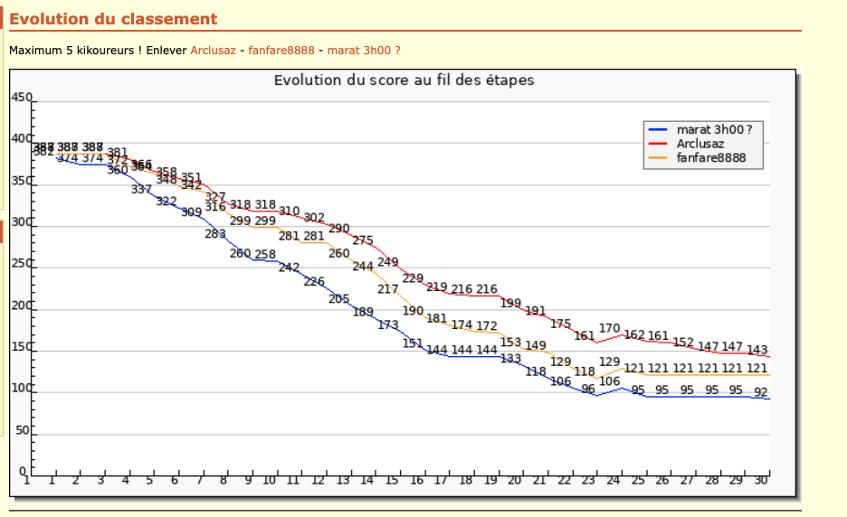 Donc, j'ai de bons scores qui resteront et pleins de gros scores à effacer. Si je fais quelques 12, ce qui n'est pas un grand exploit, je vais assez nettement remonter alors que des gens devant moi doivent déjà effacer des 12 ou des 15 pour progresser. Bien sur, je ne parle pas de la première place, je te la laisse. Mon objectif, c'est de distancer Mathias. Parce que je l'ai tellement chambré, que s'il me passe devant, je vais prendre cher....