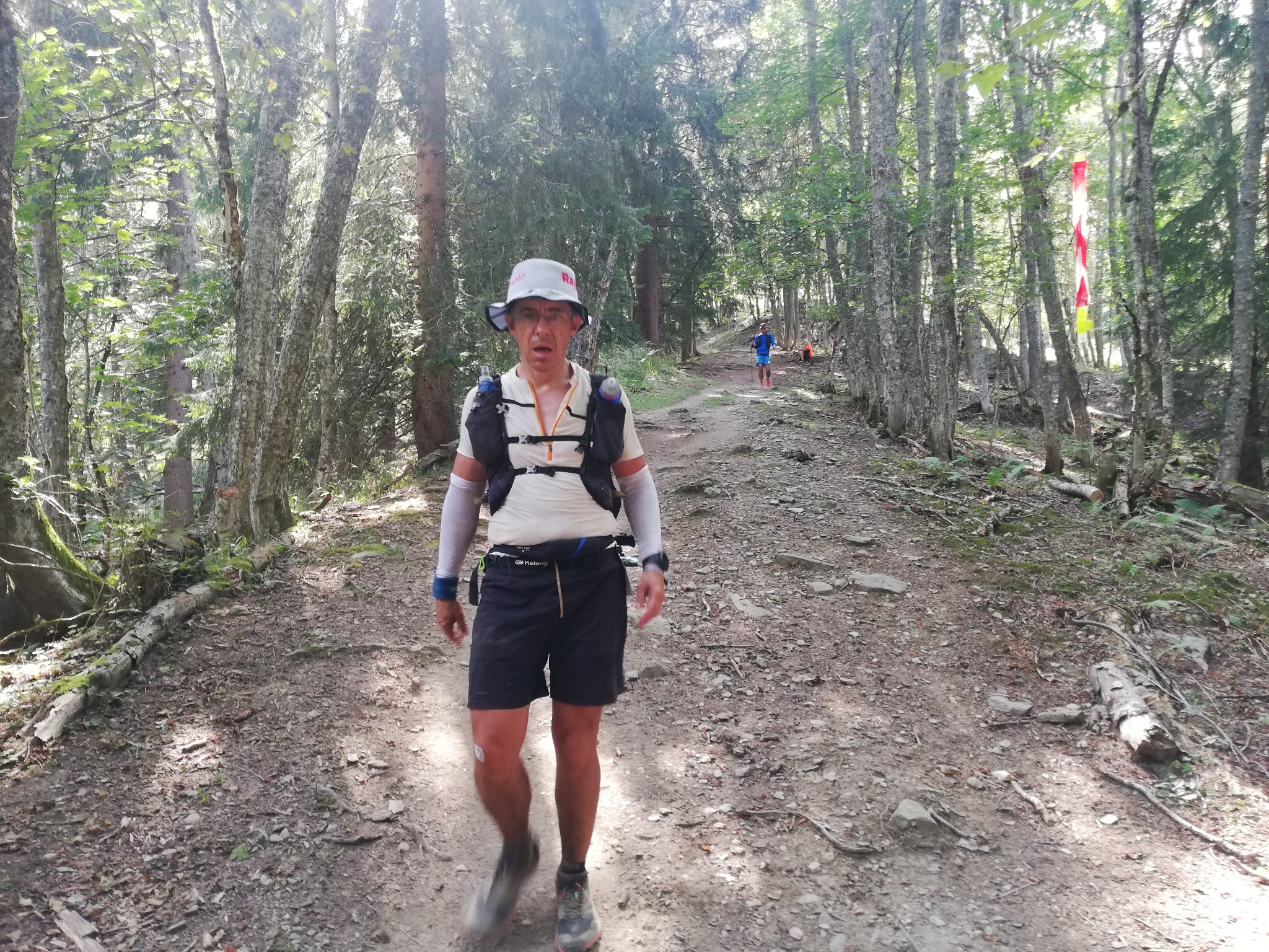 Plus que 2 BH. Les Houches à 19h15, donc seulement un peu plus d'une heure pour descendre 800D-, il faut quand même se dépouiller un peu à ce stade de la course, surtout sur l'interminable section goudronnée où on fait une tête de Z'Houches