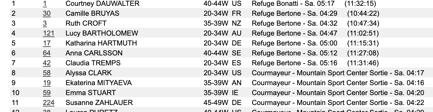 1 1 Courtney DAUWALTER 40-44W US Grand Col Ferret - Sa. 06:59 (13:14:03) La Fouly - Sa. 07:59